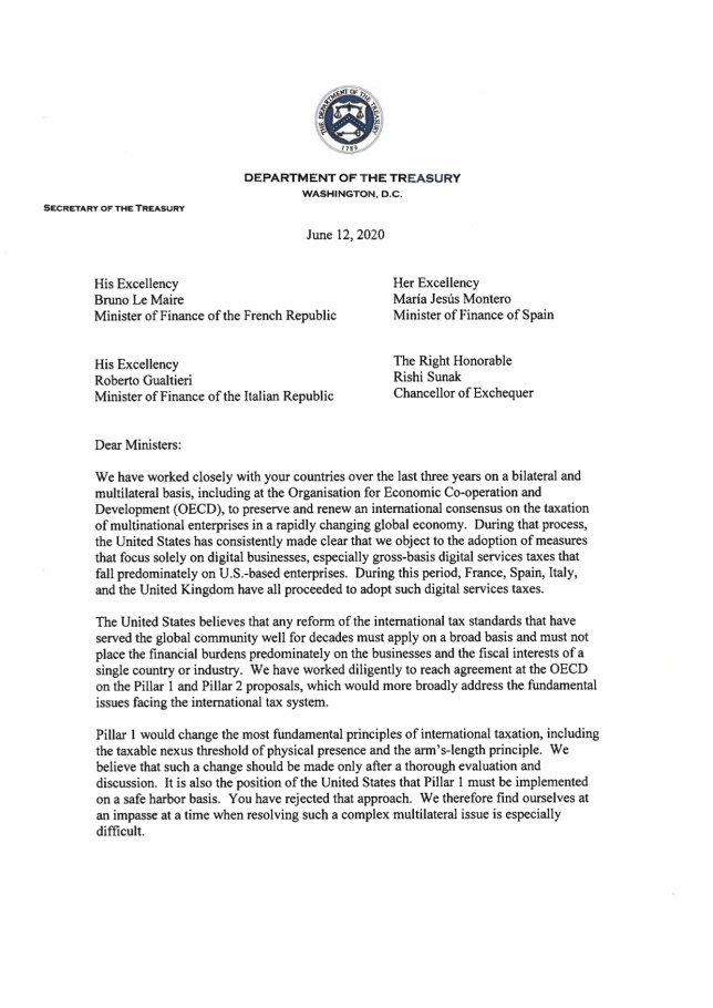 The copy of the letter comes from the blog of Allison Christians, a tax law professor at McGill University https://www.allisonchristians.com/blog/mnuchin-letter-digital-tax