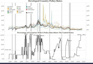 Figure 4.6 indicates that surges in the percentage of countries whose policy interest rates lie below that of the US (represented by the black line) precede US recessions (the grey areas plotted along the timeline).