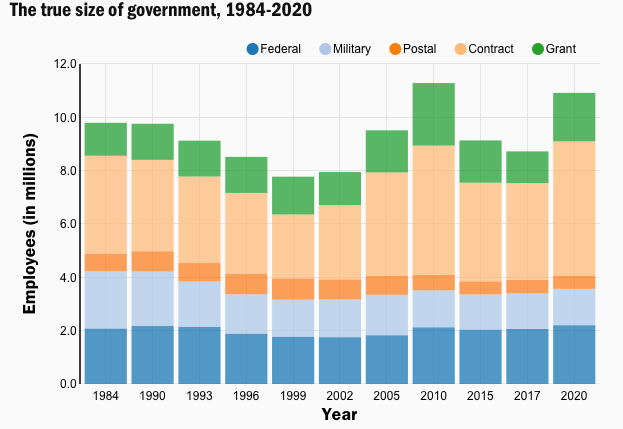 Stimulus spending will increase the proportion of government work that is contracted out. The chart below, produced by the Brookings Institution, shows that the proportion of US federal government work carried out by contract or grant has been steadily increasing since the late 1990’s. Moreover the stimulus spending from the 2008 financial crisis produced a bump in that area. It is highly likely that COVID spending will produce more of a jump.