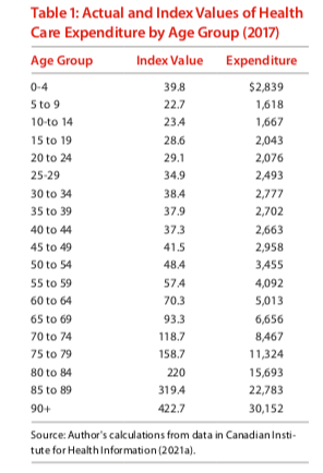 Let’s look at the amount of money spent from the health care budget for people at different life stages. The table below shows that babies and toddlers incur some significant costs to the system. After that, the usage of the system settles down nicely, until people get older. Then, the annual expenditure per senior goes up sharply, although the biggest portion is spent in the last six months of life.