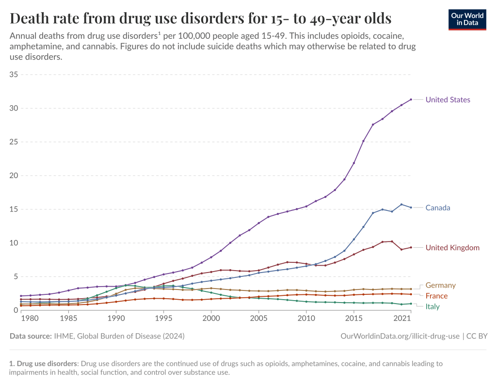 2. We have a closely-related epidemic of drug dependency and overdose death. Better off than the US, but far worse than European countries, we have drug problems that we have not dealt with. (see below).